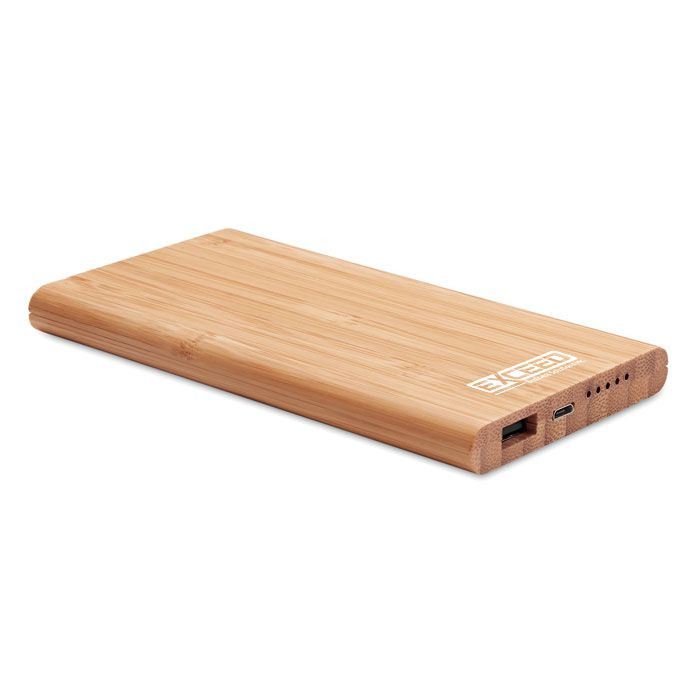 Wireless charging and power bank with 6000 mAh capacity in Bamboo casing.