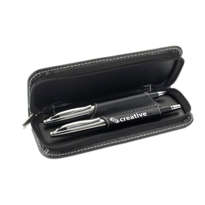 Metal pen set with ball pen and roller ball, presented in a zipped PUleather pouch in matching colour and contrasted stitching.