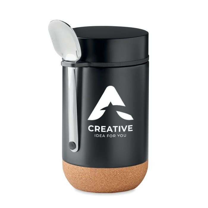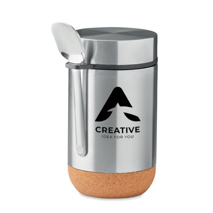 Double wall stainless steel insulated storage jar with a screw top and cork base detail.