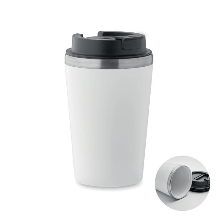 Double wall tumbler in PP outer wall with inner wall in recycled stainless steel (90% recycled stainless steel and 10% stainless steel) with a ceramic inner lining.