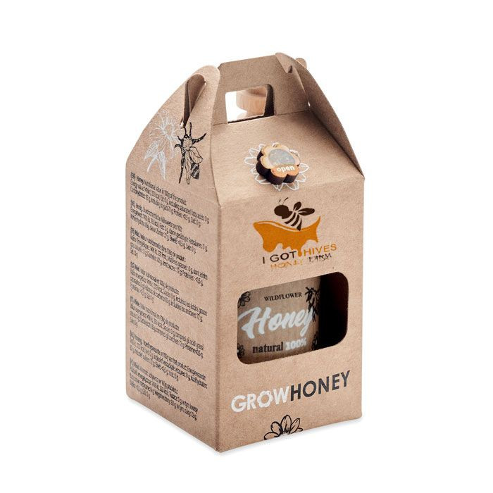 Wildflower honey jar (50g) with a wooden honey dipper.