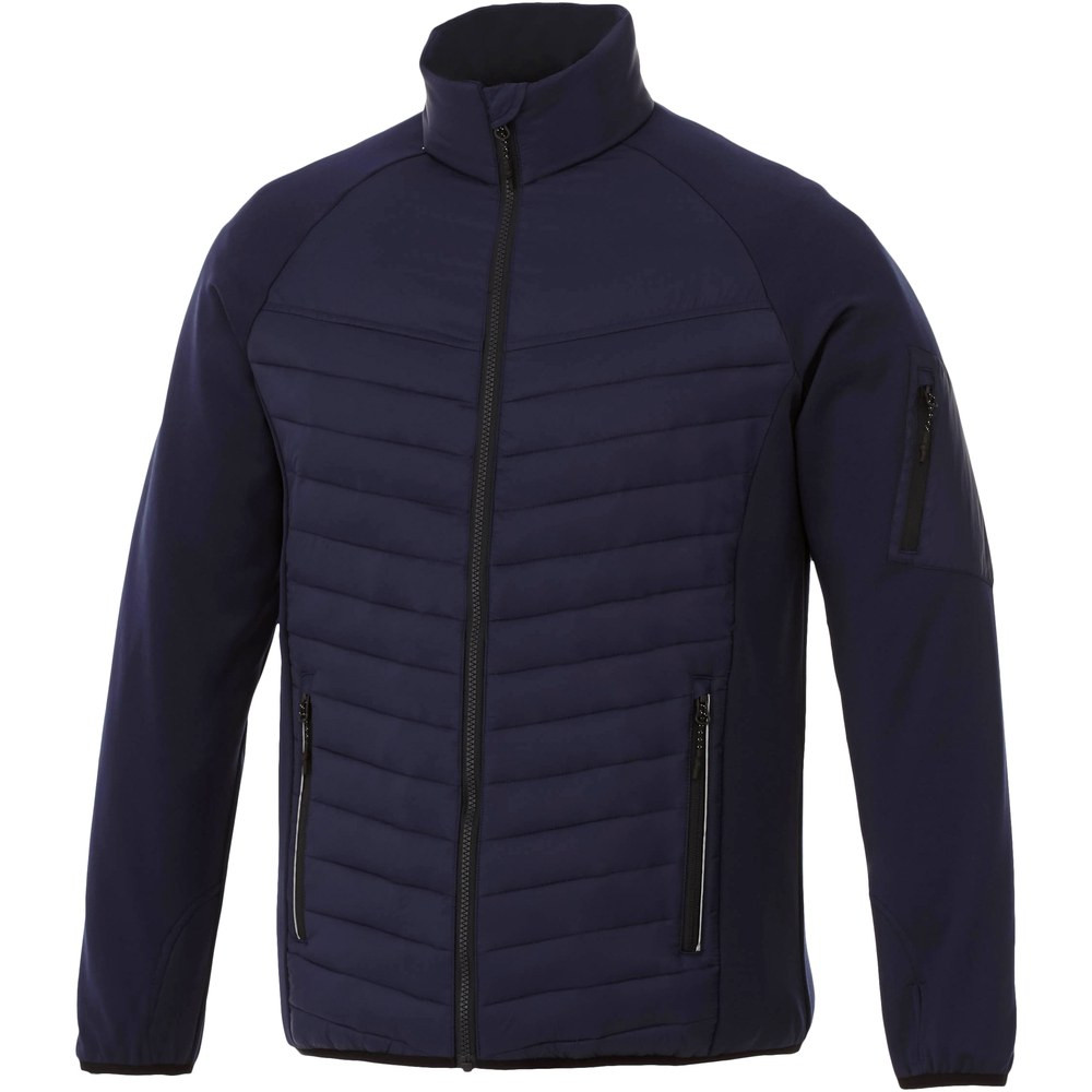 The Banff men's hybrid insulated jacket – a perfect fusion of style and performance. The inner stormflap ensures that the wind does not come through the jacket, and the dropped back hem adds an extra touch of coverage for added warmth. The elasticated binding in a contrasting colour adds a stylish accent while ensuring a secure fit. The jacket's dull cire 380T woven fabric has a water repellent and downproof finish, made of nylon (38 g/m2). The contrast fabric is an interlock knit made of polyester and elastane (245 g/m2), adding flexibility and comfort. The fake down insulation of polyester provides lightweight warmth, perfect for chilly days.