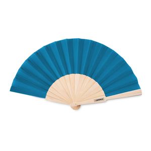 Manual hand fan in wood with polyester fabric.