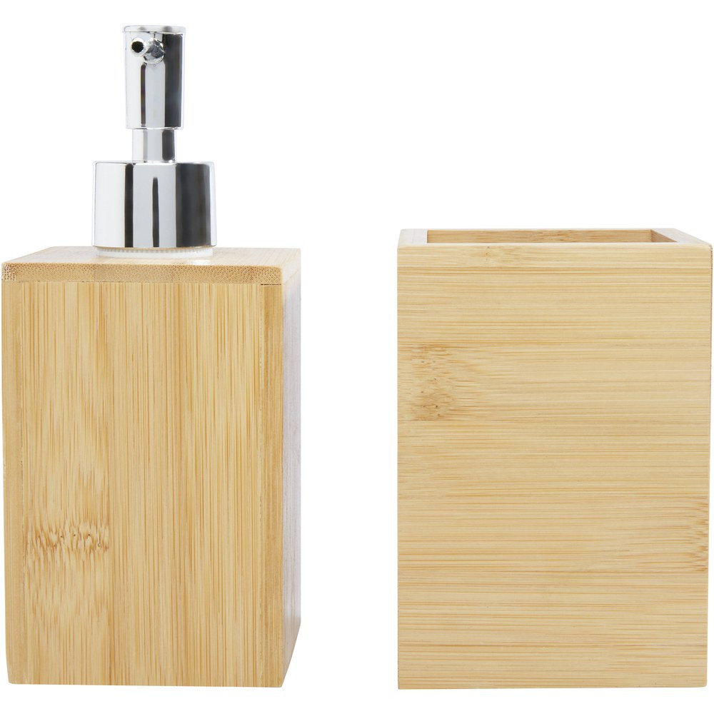 3-piece bamboo bath accessory set in modern design featuring a soap dish with a strainer (11 x 8.2 x 2.4 cm), a soap or lotion dispenser (7.1 x 7.2 x 16.8 cm), and a toothbrush holder (8 x 8 x 11.5 cm). The bamboo used is sourced and produced following sustainable standards.