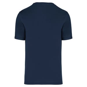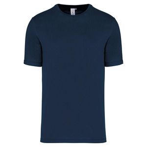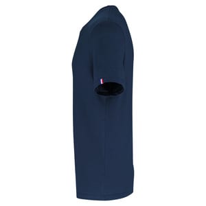 Blue/white/red clip label at hem of left sleeve garment worn.