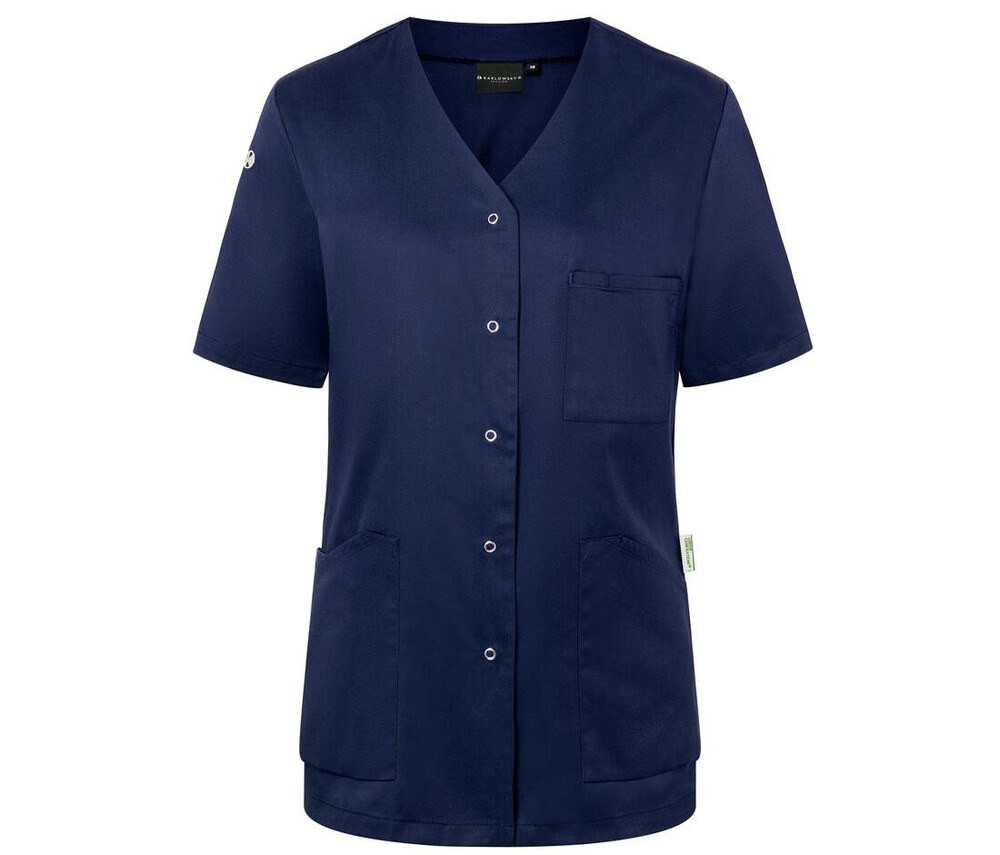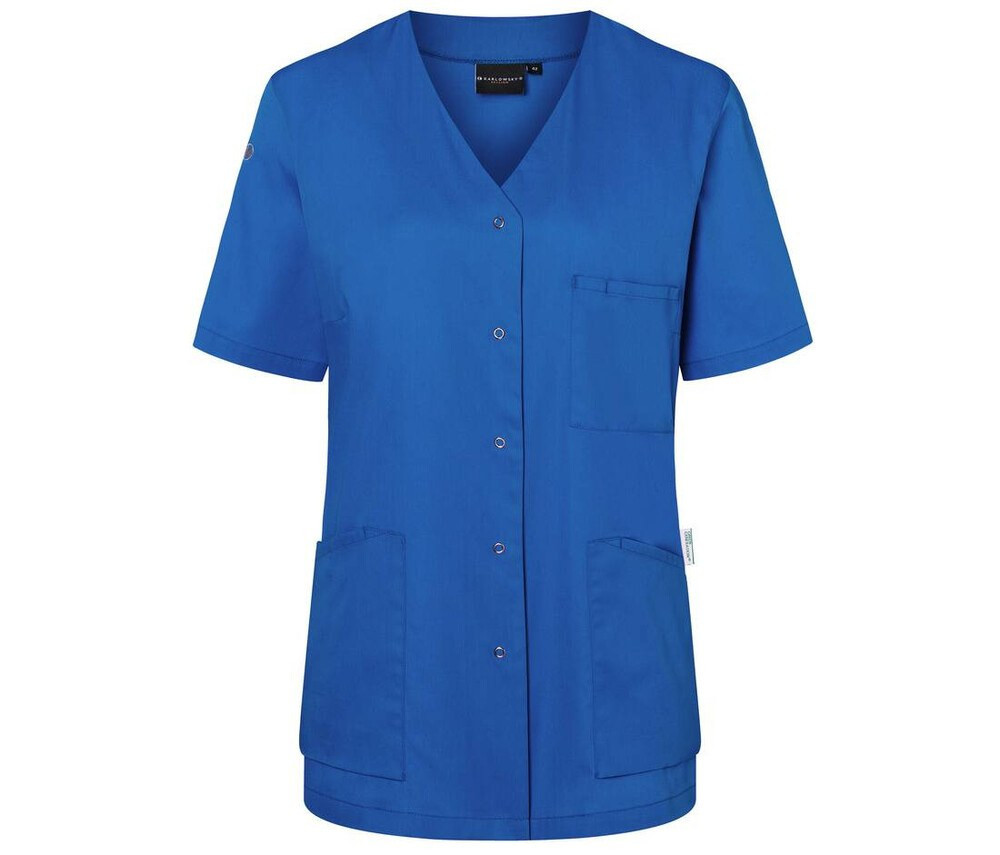 Suitable for medicine, care, wellness, cosmetics, cleaning activities. Washable at 95°. V-neck. Slightly waisted cut. 2 patch side pockets with concealed inner pocket on the right. Chest pocket. 5 central buttons.