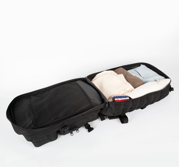 It also has a large front compartment with a decorative hook and loop patch, M.O.L.L.E.