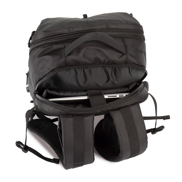 Adhesive ribbon on the back so the backpack can be slipped over the handle of a suitcase for comfortable transport.