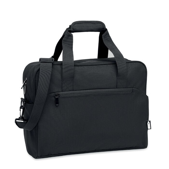 Carry-on hand luggage travel bag in 600D RPET with large zippered front pocket, two small side pockets.