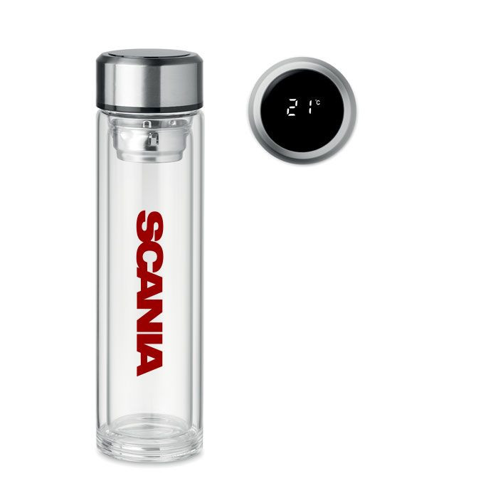It has an LED touch thermometerincorporated in to the top of the lid and tea infuser inside.