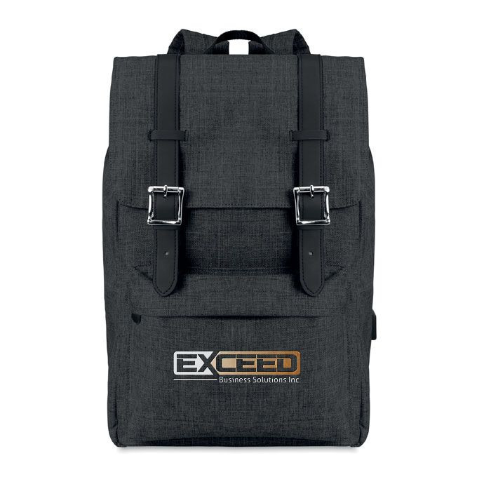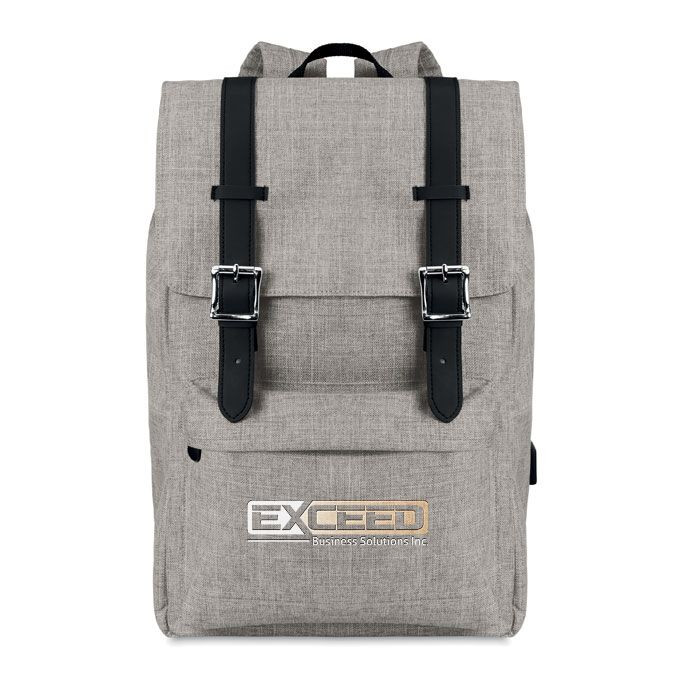 Computer backpack in 600D 2 tone polyester with padded shoulder strap including one main internal compartment for 15 inch laptop and a USB charging cable.