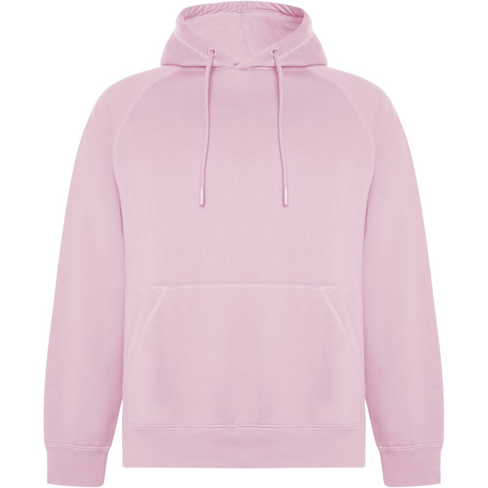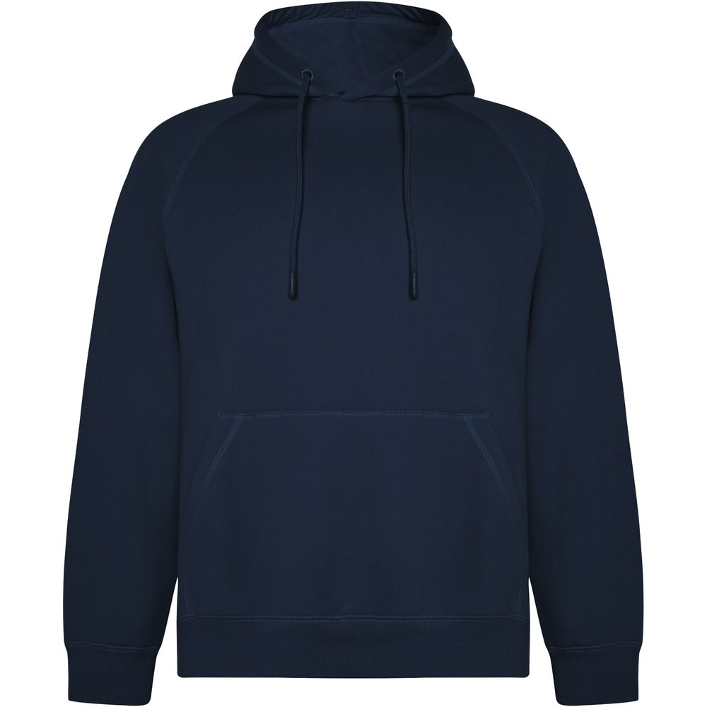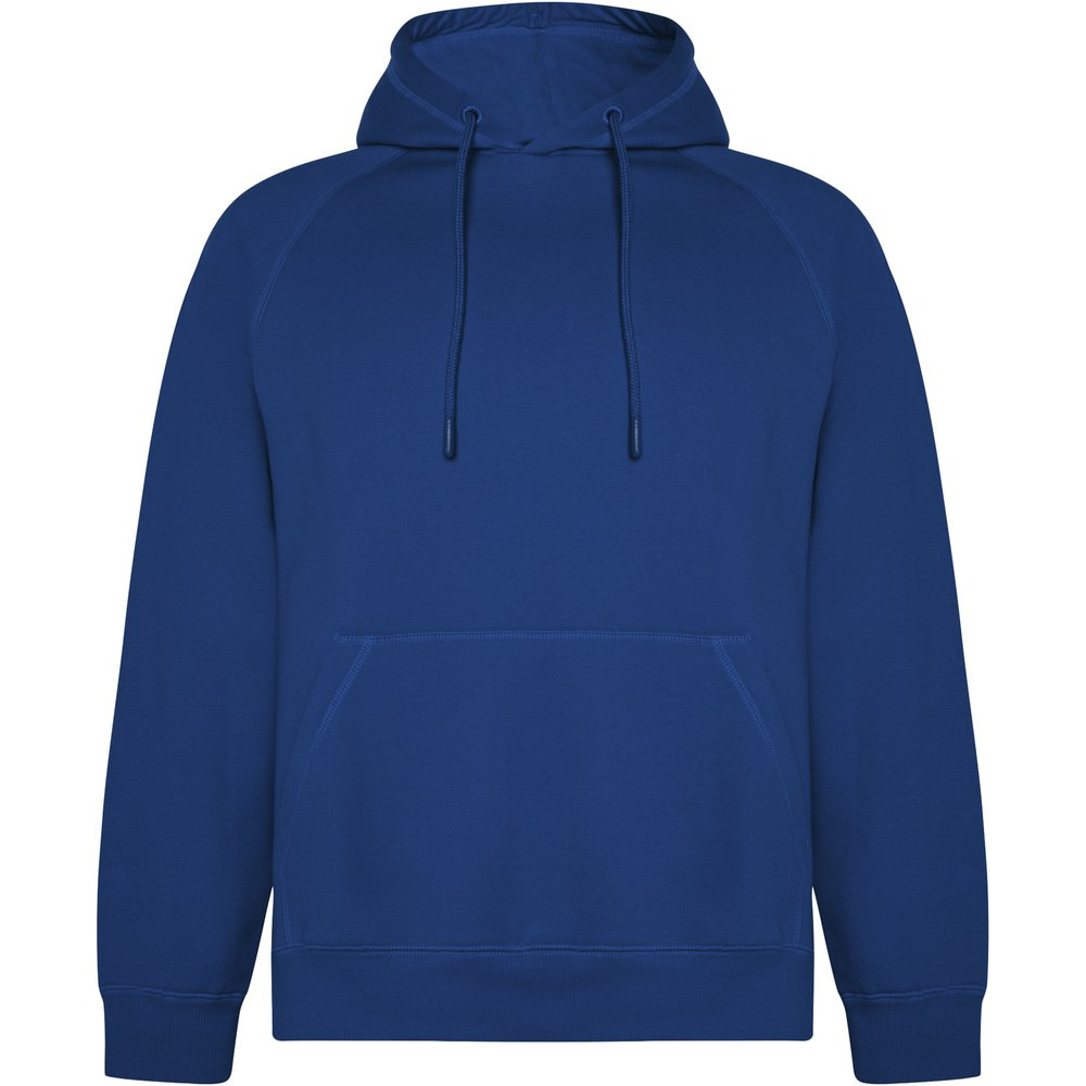 Unisex hoodie in organic cotton and recycled polyester. Kangaroo style pocket. Single jersey lining in hood. Round adjustable drawcord and embroidered eyelets. Cuffs and waistband in 2x1 ribbed fabric. Removable label. Individual recycled packing. The male model is 185 cm and is wearing size L, and the female model is 168 cm and is wearing size S.
