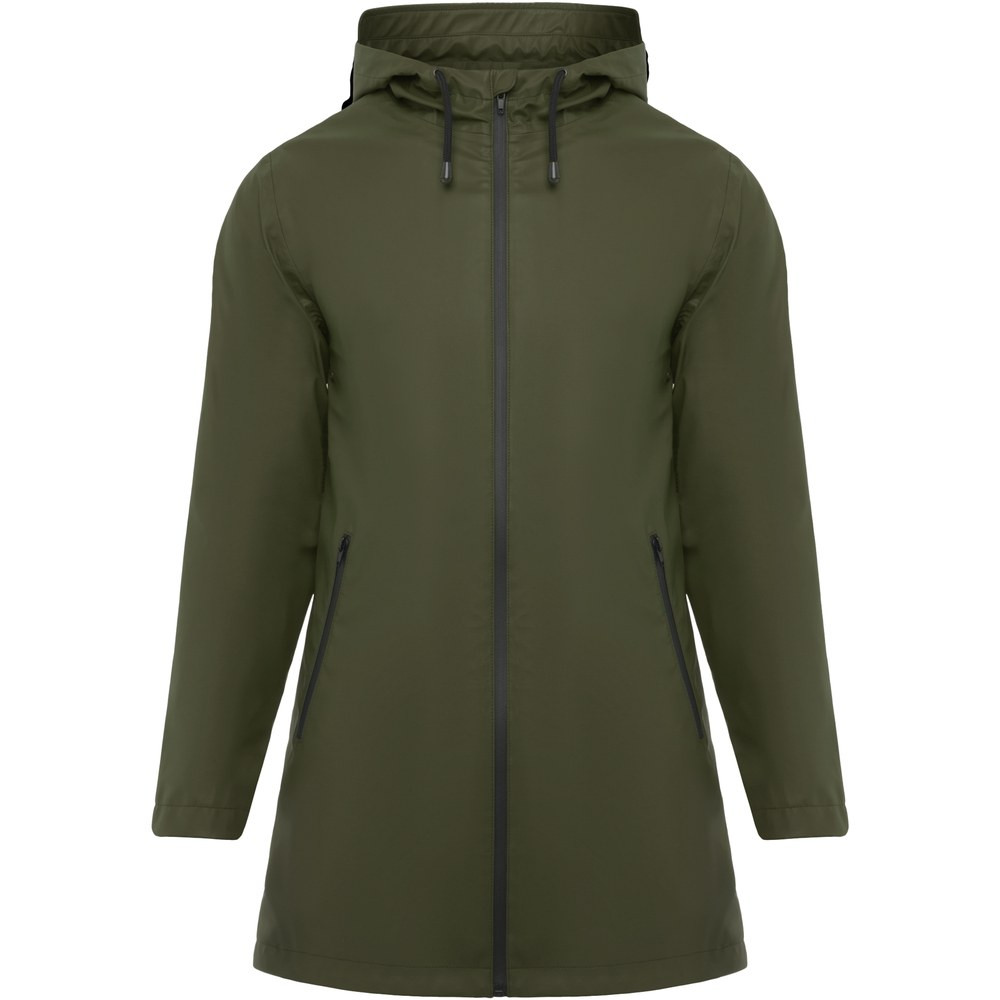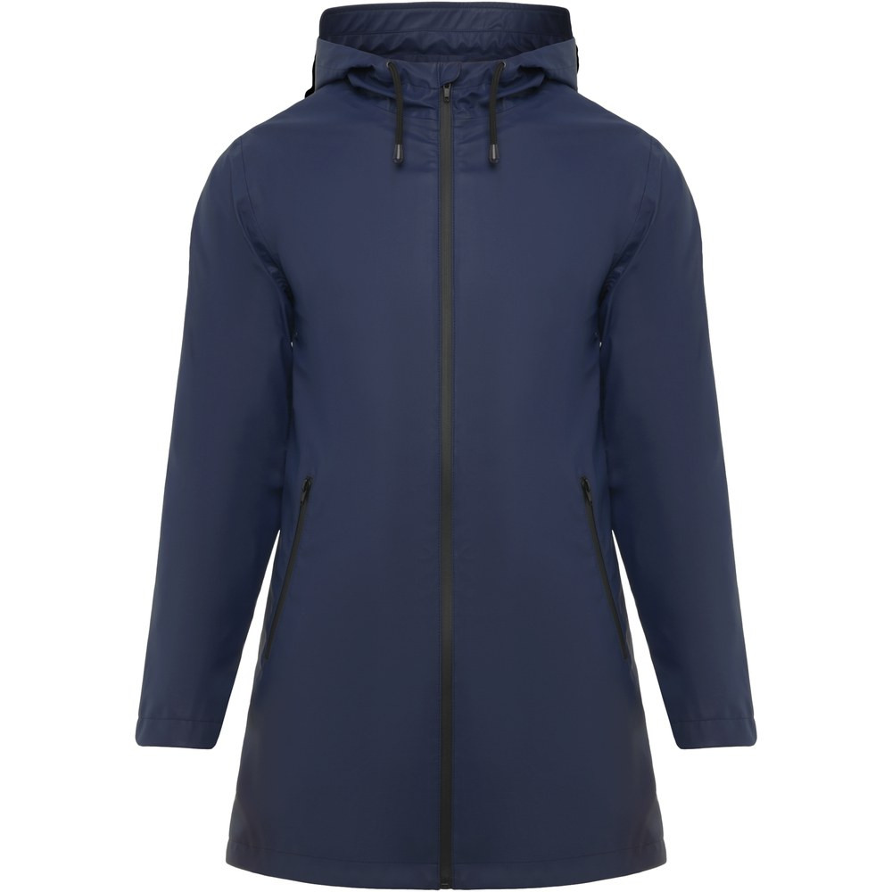 Waterproof raincoat for women. Hood with peak. Heat-sealed zips and seams. Contrasting details in black. Two side pockets with zip. Slit on back hem. Removable label. Waterproof. The model is 179 cm and is wearing size S.