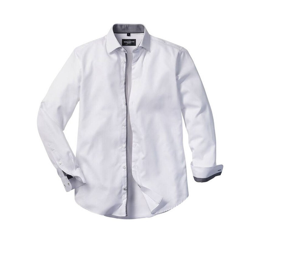 Classic button down shirt with an original twist: contrasted inside cuffs, collar and piping, and contrast edging around the lower button placket. The cuffs are rounded and adjustable. Elegant and nicely shaped, with darts at the back improving the fit.