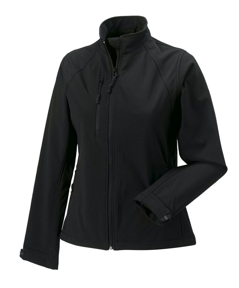3 layer softshell fabric with breathable membrane and bonded microfleece lining, water resistant to 5000mm. Side pockets and chest pocket with inner lining, reversed zip and cord pulls. Full zip with inner storm flap and zip neck protector at collar. Bungee cord in hem. Adjustable cuffs. Drop tail. Feminine fit. Large left chest side decoration access. Fully launderable at 40°C.
