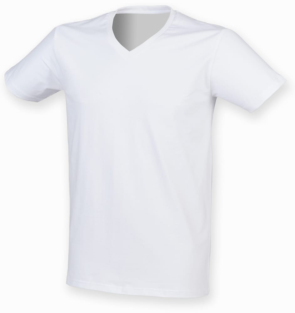 Feel good men's stretch t-shirt with enzyme wash for unique soft hand-feel. 96% cotton, 4% elastane for improved fit, comfort and shape retention. Modern long-line fit. V-neck with back neck binding and soft stretchy rib neckline. Features new tearable removable label. Washing Instructions Wash at 40°C. Wash dark colours together. Do not bleach. Reshape whilst damp. Dry out of direct sunlight. Do not tumble dry. Iron on reverse of decoration.