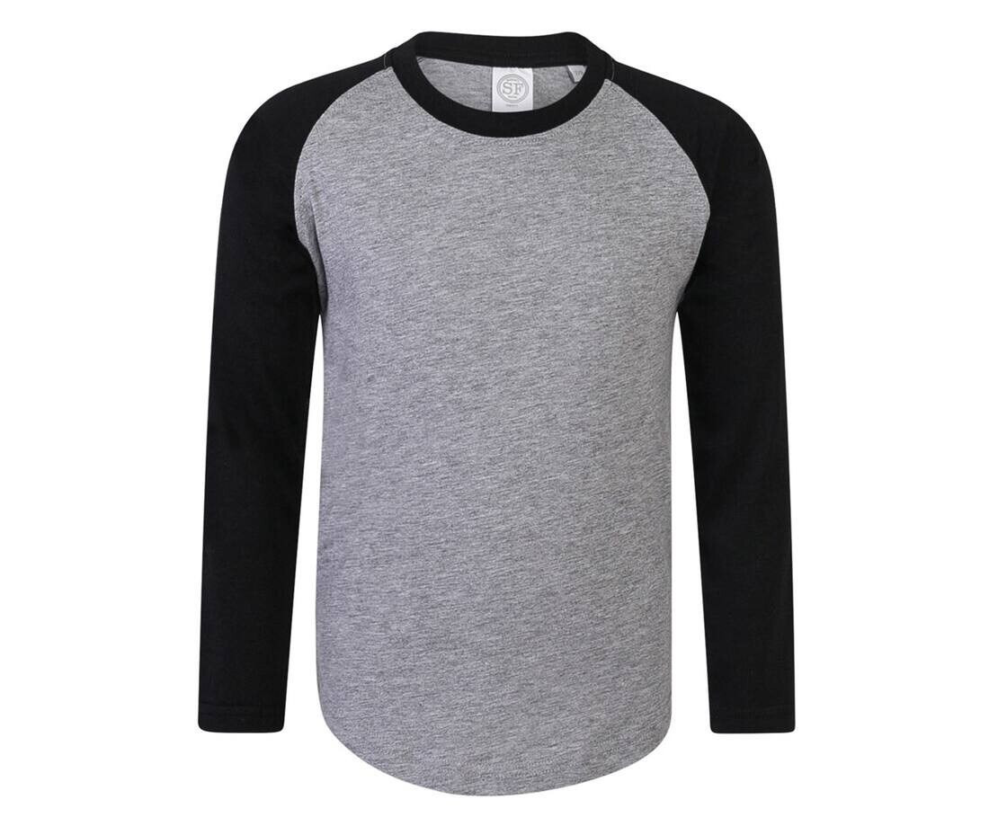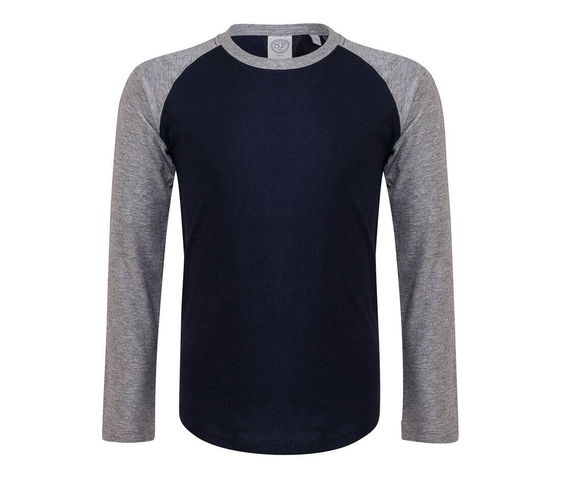 Tear-out SF (Skinnifit) label. Contrast raglan sleeve and ribbed neck with back-neck tape. Long-line fit and shaped side seams. Twin-needle curved hem. Unisex. Matches Men's SK271 and Ladies' SM271 Long Sleeved Baseball T's