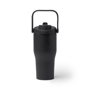 Features a screw lid with an automatic dual opening dispenser operated by a push button, incorporating a foldable straw.