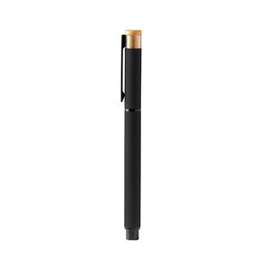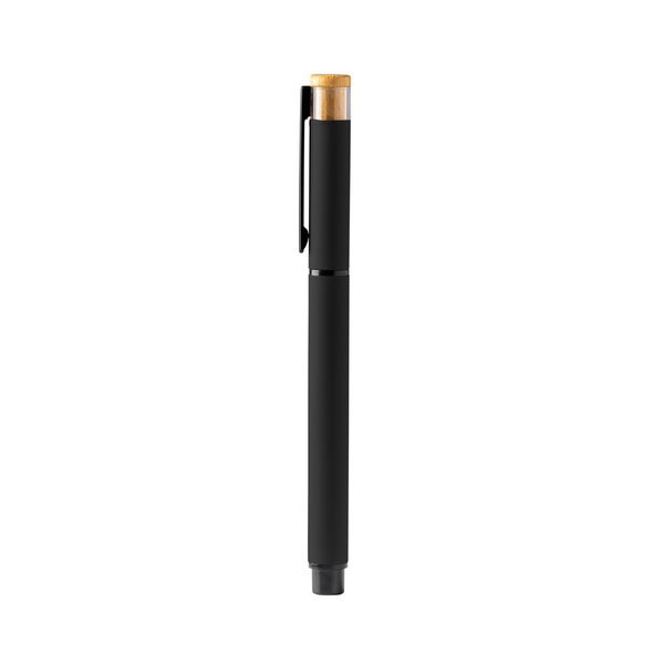 Roller ballpoint pen with recycled aluminium body, metal clip and bamboo detail.