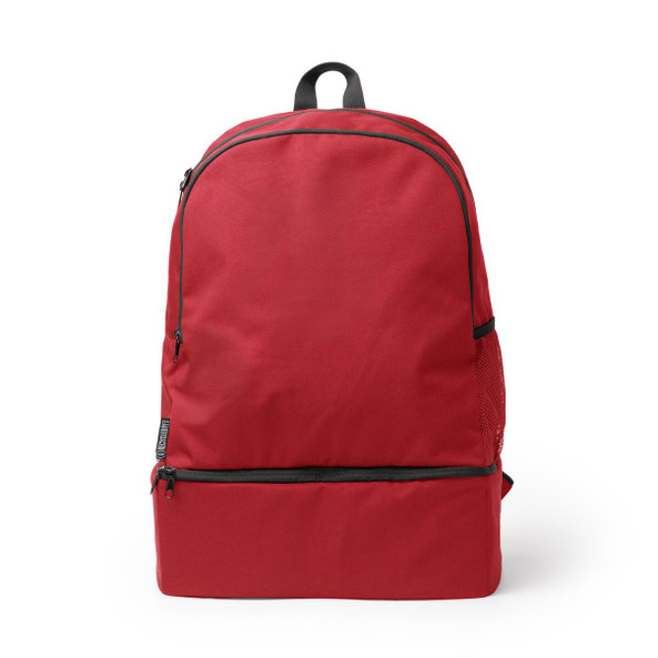 It has a side pocket in mesh fabric with elastic adjustment for carrying bottles At the bottom, it includes a rigid shoe compartment that allows belongings to be separated from the rest of the backpack.