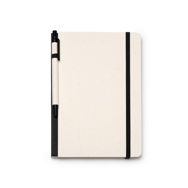 Hard cover with elastic band and page marker matching the colour of the ballpoint pen.