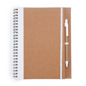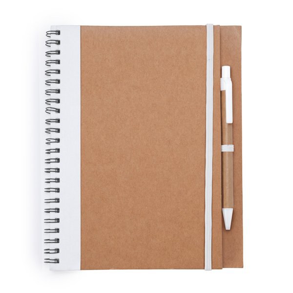 Spiral ring notebook with recycled cardboard hardcovers.