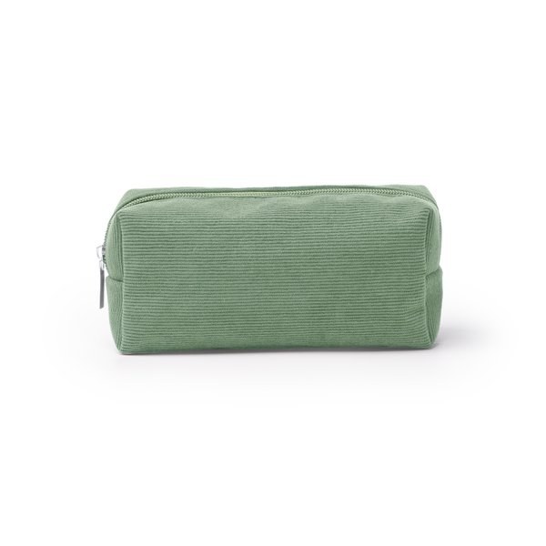 Corduroy toiletry bag with a main compartment and a zip closure in a matching colour to the body.