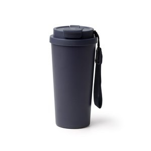 Features a lid with a flip-up straw and an individual closure on one side, plus a dispenser with a cap on the opposite side.