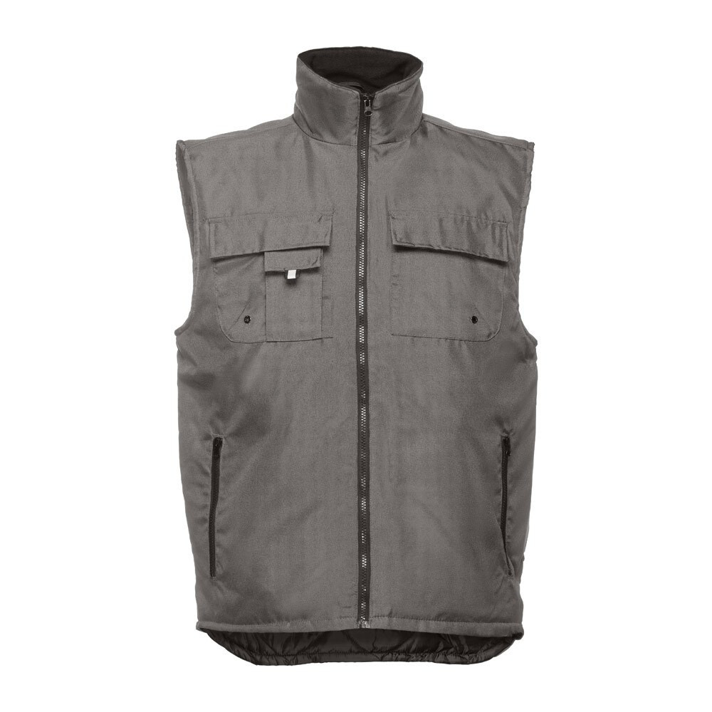 Men's padded work vest in 100% oxford polyester with an acrylic coating (170 g/m²), lined in 100% taffeta polyester (65 g/m²). Fleece lined collar and elastic sides for better fit. Contains 6 pockets: 5 front pockets, including 2 with inner zip plus 1 for mobile phone, and 1 inside pocket. Zipped access at the back for easy customisation
