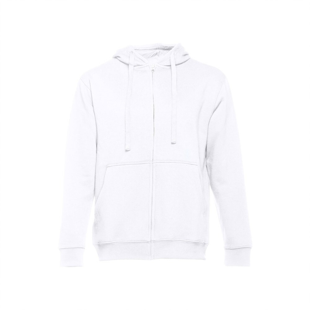 50% cotton and 50% polyester men's sweatshirt (320 g/m²) with carded interior. The hood is lined and contains colour cord closure. The front area has two marsupial pockets with plastic cover closure. Piece with cuffs and ribbon waistband