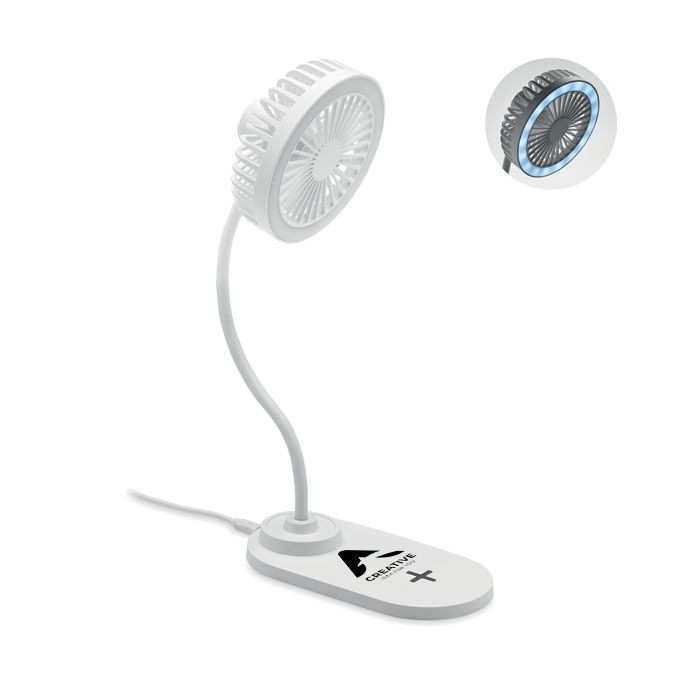 ABS Desktop fan with 3 speed settings with LED light (80 lumens) and 10W wireless charger.