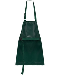 Recycled plastic strap and adjustable buckle at neck and waist for adjusting apron size.