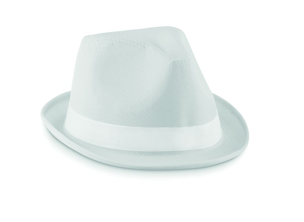 Coloured hat in polyester straw with white coloured band.
