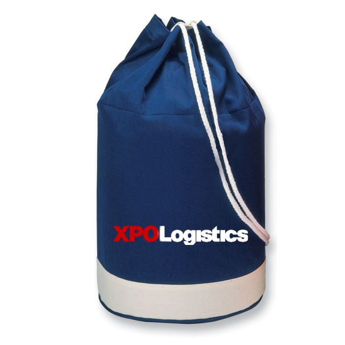 Bicolour cotton navy duffle bag with white stripe.