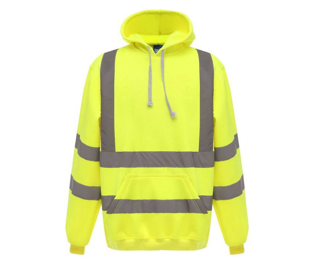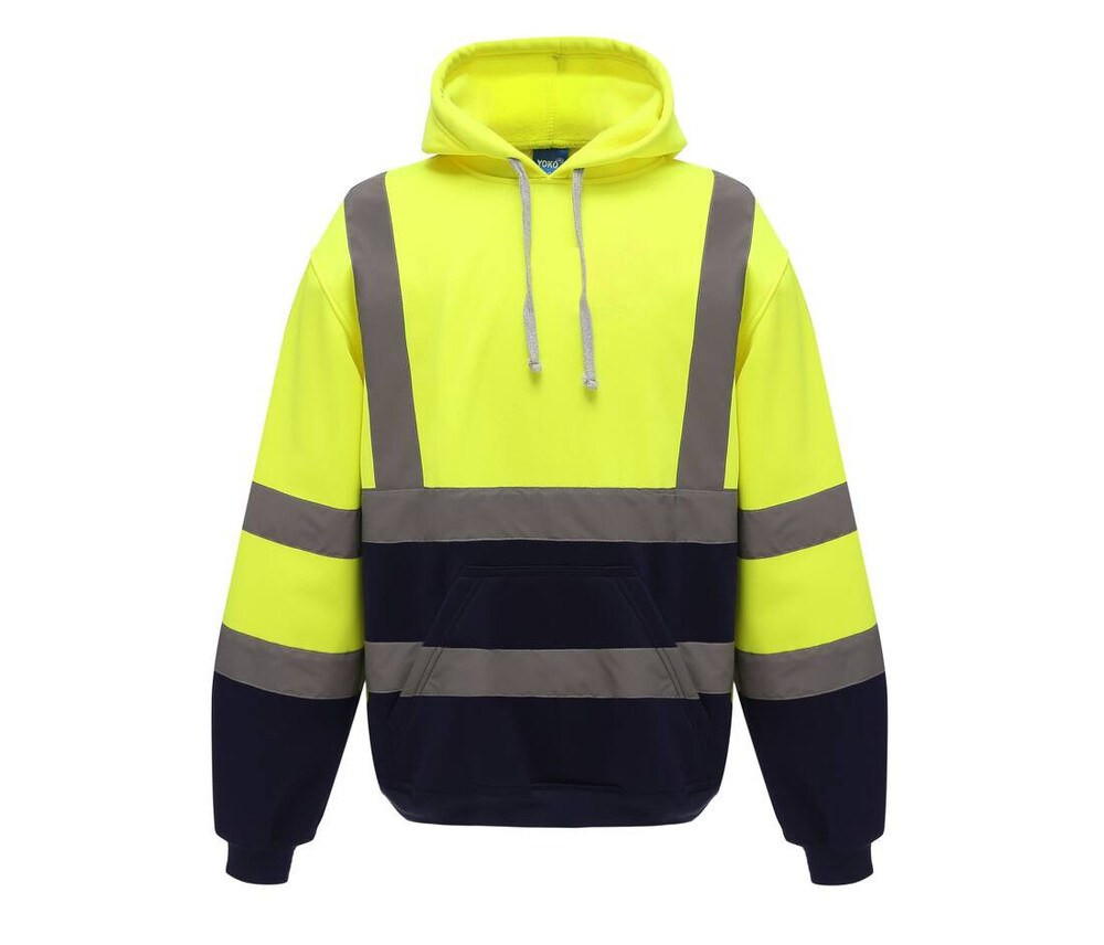 Ensure your safety with this high-visibility hoodie! Available in solid color (yellow or orange) and in two colors (yellow/navy or orange/navy).